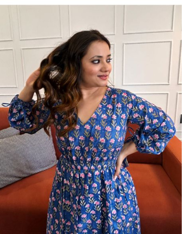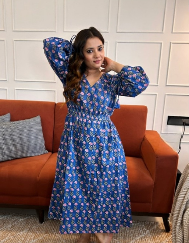 This midi dress features a comfortable elasticated waist for a flattering fit. Designed with full sleeves finished with delicate tying knots at the cuffs.The dress comes with functional pockets on both sides, making it stylish yet practical for everyday wear.