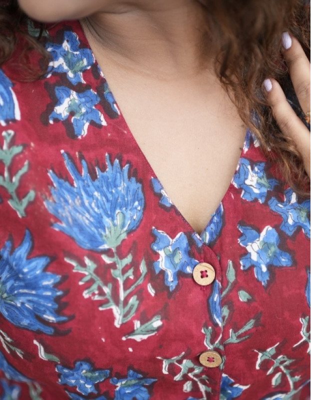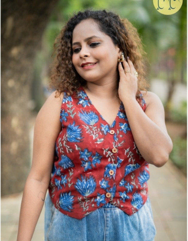 This handcrafted vest Top features an elegant hand block print that brings a rich,pattern includes a classic v-neck front A front button closure adds a refined touch..