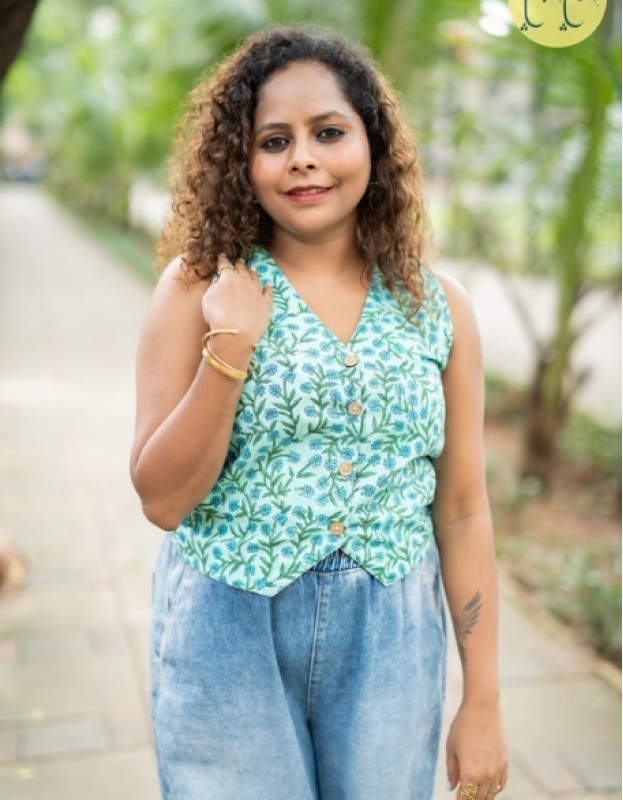 This handcrafted vest Top features an elegant hand block print that brings a rich,pattern includes a classic v-neck front A front button closure adds a refined touch..